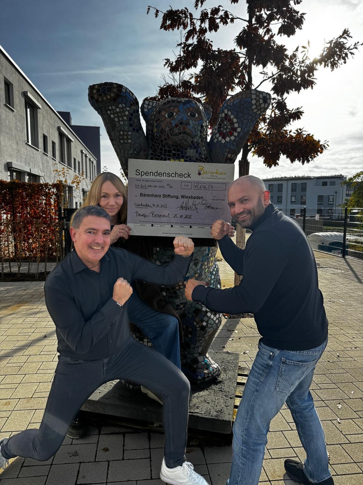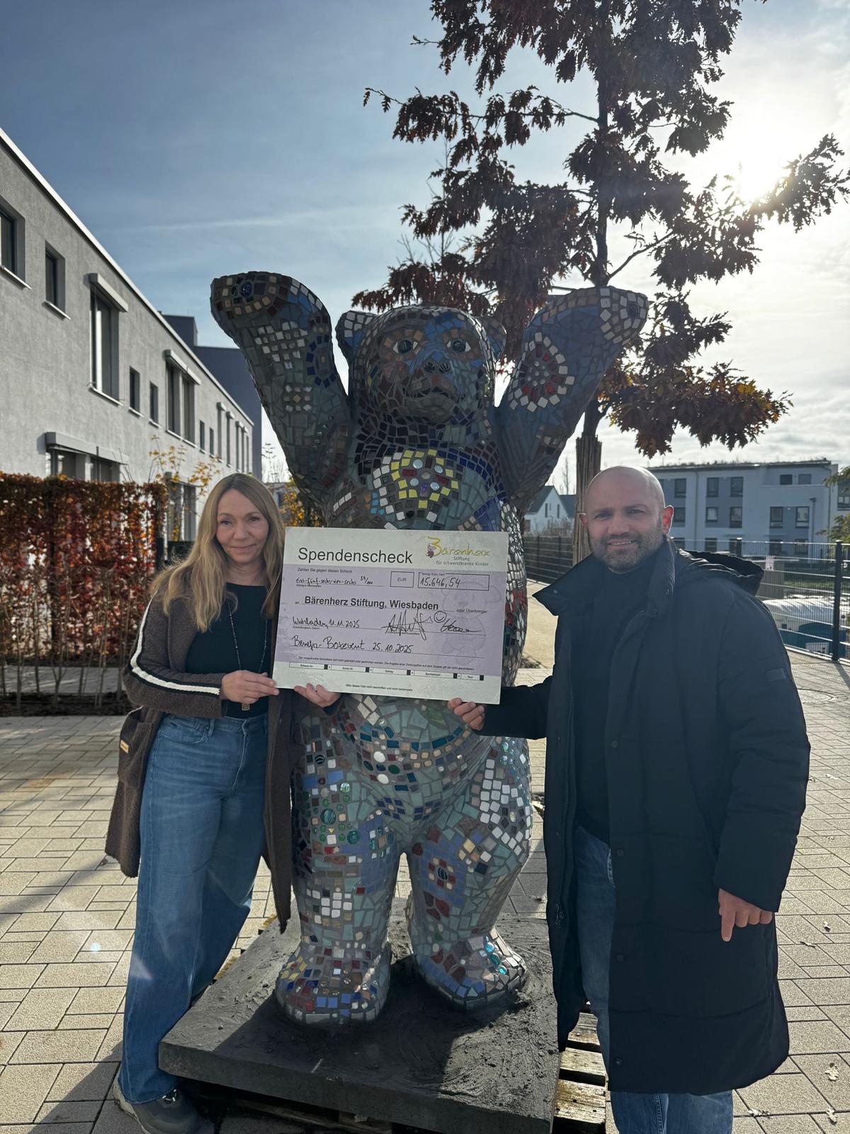 Zu der Veranstaltung mit Amateur- und Profikämpfen kamen unglaubliche 1.500 Menschen und das Spendenziel wurde somit nicht nur erreicht, sondern auch durch weitere Unterstützer*innen und Sponsor*innen mehr als übertroffen. Nach der Auszählung sämtlicher Spendentöpfe konnten nun weitere 15.646,54 Euro für Bärenherz in Form eines riesigen Schecks von unserer Zweiten Vorsitzenden Katja Heinen und Fatih Altunkaya, Vorsitzender des Wiesbadener Boxclub e.V., in dieser Woche an das Kinderhospiz übergeben werden.